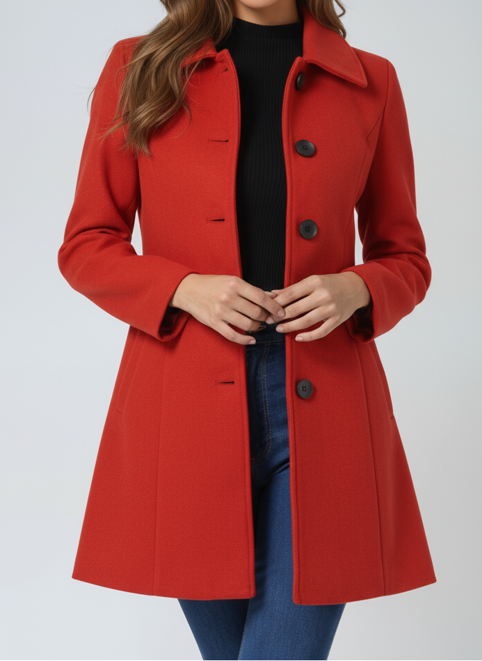 Der leicht taillierte Schnitt betont dezent die Silhouette, während die feminine A-Linie für Bewegungsfreiheit und Komfort sorgt. Der einreihige Knopfverschluss und der klassische Kragen machen Leonila™ zu einem vielseitigen Begleiter – perfekt für den Alltag, Stadtbesuche oder elegante Wintermomente.